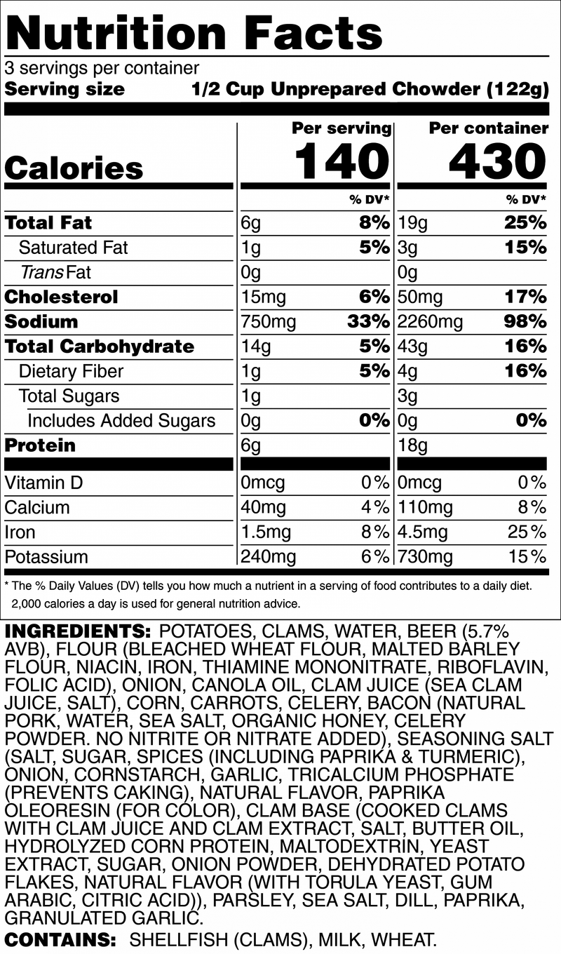 Plump, delicious clams, herbs and spices are blended with hickory-smoked bacon and a full-bodied craft beer for a rich, creamy, warm-your-body-down- to-your-toes experience!
