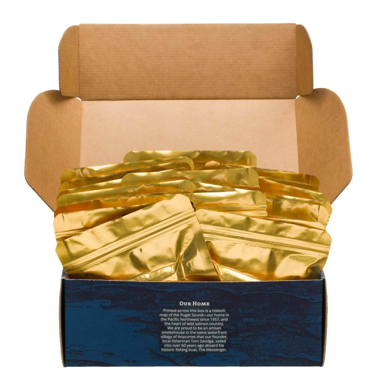 This product utilizes the signature SeaBear Gold Seal Pouch. Each pouch acts like a flexible can, making it versatile and preserving your fully-cooked smoked salmon for four years, with the potential for longer if kept intact. The gold seal pouch eliminates the need for refrigeration, making your salmon ready to eat upon opening.