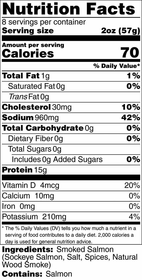 Smoked Salmon Lox can be stored in the freezer for up to six months. Once thawed, but unopened, keep refrigerated for up to 30 days. Once you’ve opened, enjoy it within 2-3 days. Each pouch features a chart on the back for use of marking when you have thawed and opened your Smoked Salmon Lox.